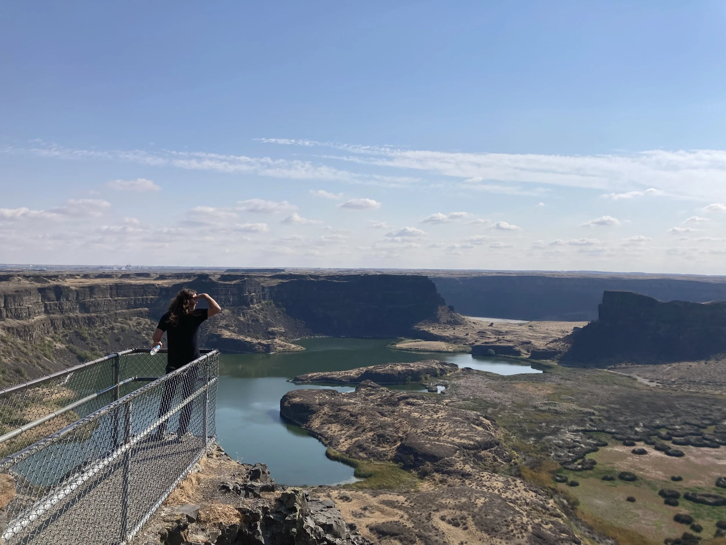 Kyle of the Brothers of the Serpent Podcast (and the band 50 Dollar Dynasty) on the catwalk over Dry Falls Cataract, Lower Grand Coulee.